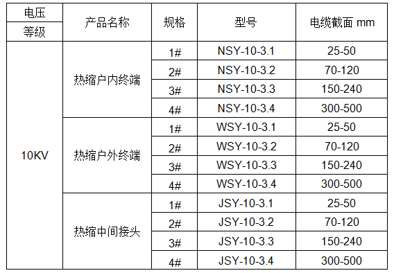 10KV、20KV、35KV热缩电力电缆终端头、中间接头系列产品,集防水、应力控制、绝缘于一体。具有良好的电气性能和机械性能,能在各种恶劣的环境条件下长期使用。具有重量轻、安装方便等优点。广泛地应用电力、石油化工、治金、铁路港口和建筑领域。
